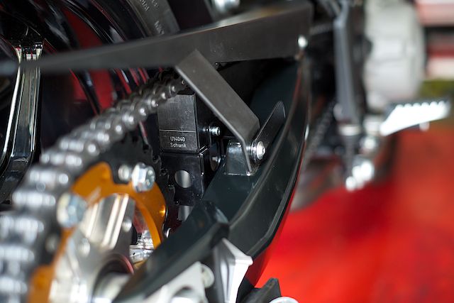 Dabei läuft die Kette über einen an der Schwinge montierten Graphitblock und wird durch Kontakt ständig geschmiert - allerdings eben nicht mit Öl oder Fett und somit sabberfrei. Dummerweise braucht man hierfür einen für den jeweiligen Motorrad-Typ passenden Halter. Da die Schwinge der Nuda mit der der BMW F800R baugleich ist, wagte ich den Versuch und bestellte mir das System für eine F800R. Und siehe: Bis auf eine kleine Änderung am Kettenschutz passt es wie angegossen.